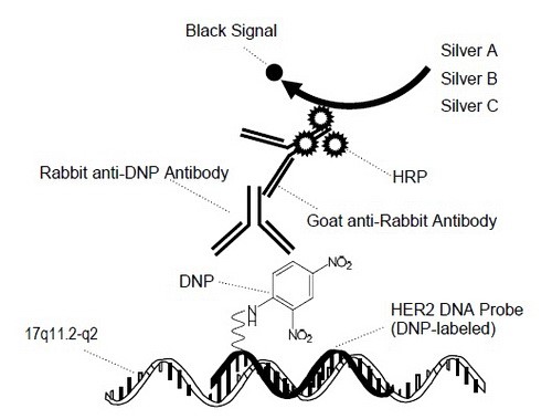 During the staining process, the DNP and DIG labeled probes are co-hybridized to their respective specific target DNA sequences (HER2 and chromosome 17, respectively) within the cell nuclei. Then detection of HER2 signals occurs first by ultraView SISH DNP Detection Kit, as a black intranuclear signal, followed by detection of chromosome 17 signals by ultraView Red ISH DIG Detection Kit, as a red intranuclear signal.
