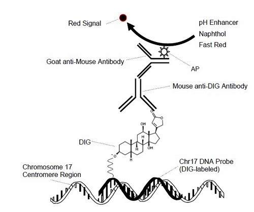 3- ultraView Red ISH DIG (digoxigenin) Detection Kit: detects chromosome 17 DNA probe sequence.