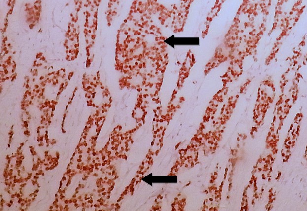 Fig. 4. Invasive Ductal Carcinoma of Breast with Positive Brown Nuclear Staining (arrows) of Estrogen Receptor (ER) Immunohistochemistry of Score 8/8 According to Allred Scoring Method (20X).