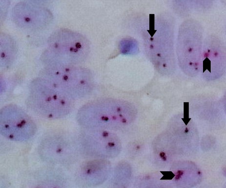 Fig. 6. Invasive Ductal Carcinoma With Non-Amplified HER2 Gene by the Silver DNA in Situ Hybridization Technique; HER2 gene black SISH intranuclear signals (arrows) typically appear smaller than chromosome 17 red ISH intranuclear signals (arrow heads) with an overall ratio of (black SISH signals/red ISH signals) < 2 (60X).