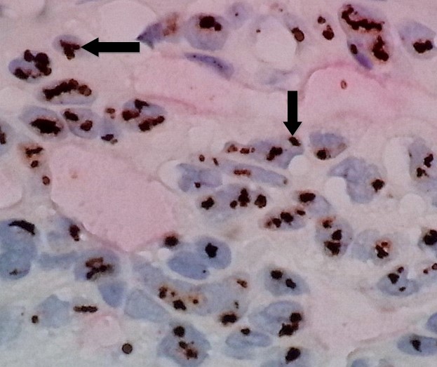 Fig. 10. Invasive Ductal Carcinoma With Huge Amplification of HER2 Gene by Silver DNA in Situ Hybridization Showing Gene Cluster (signal clusters) Formations; the HER2 gene black SISH clusters appear as grape-like formations (arrows) composed of dozens of individual signals. In such cases with huge amplification, the HER2 gene clusters may mask some of the chromosome 17 red ISH signals. Ratio of (black SISH signals/red ISH signals) = 8.5 (60X)