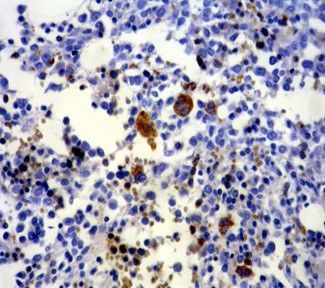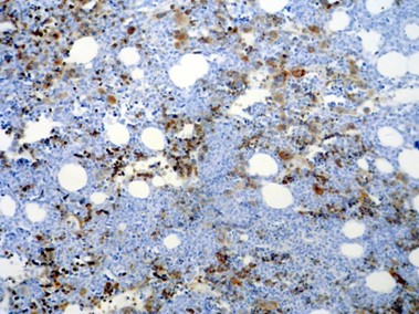 Fig 1. Normal bone marrow stained by α-synuclein. Erythroid precursors, RBCs, and megakaryocytes show strong staining, while the other cells are negative (x200).