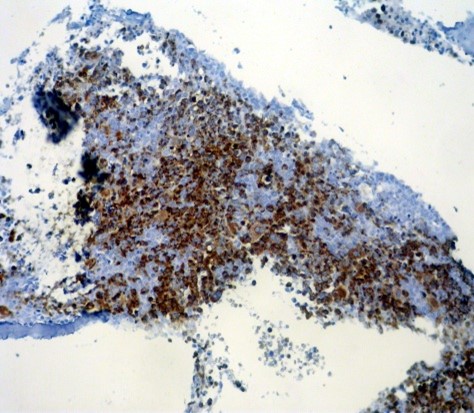Fig 3. α-synuclein staining in AML-M6; all of the erythroid precursors and few scattered megakaryocytes are positive, whereas non-crythroid blasts are negative (x100).