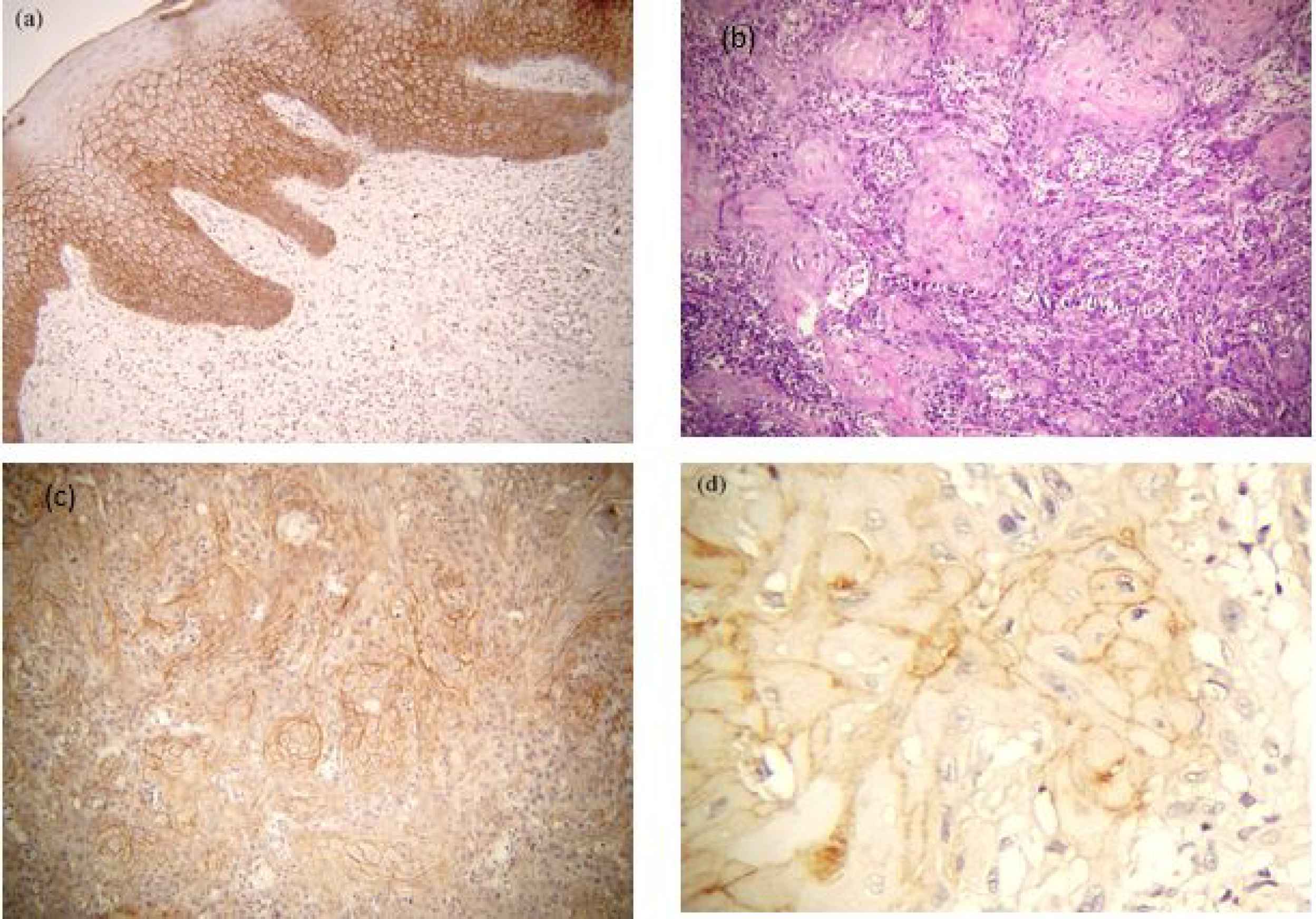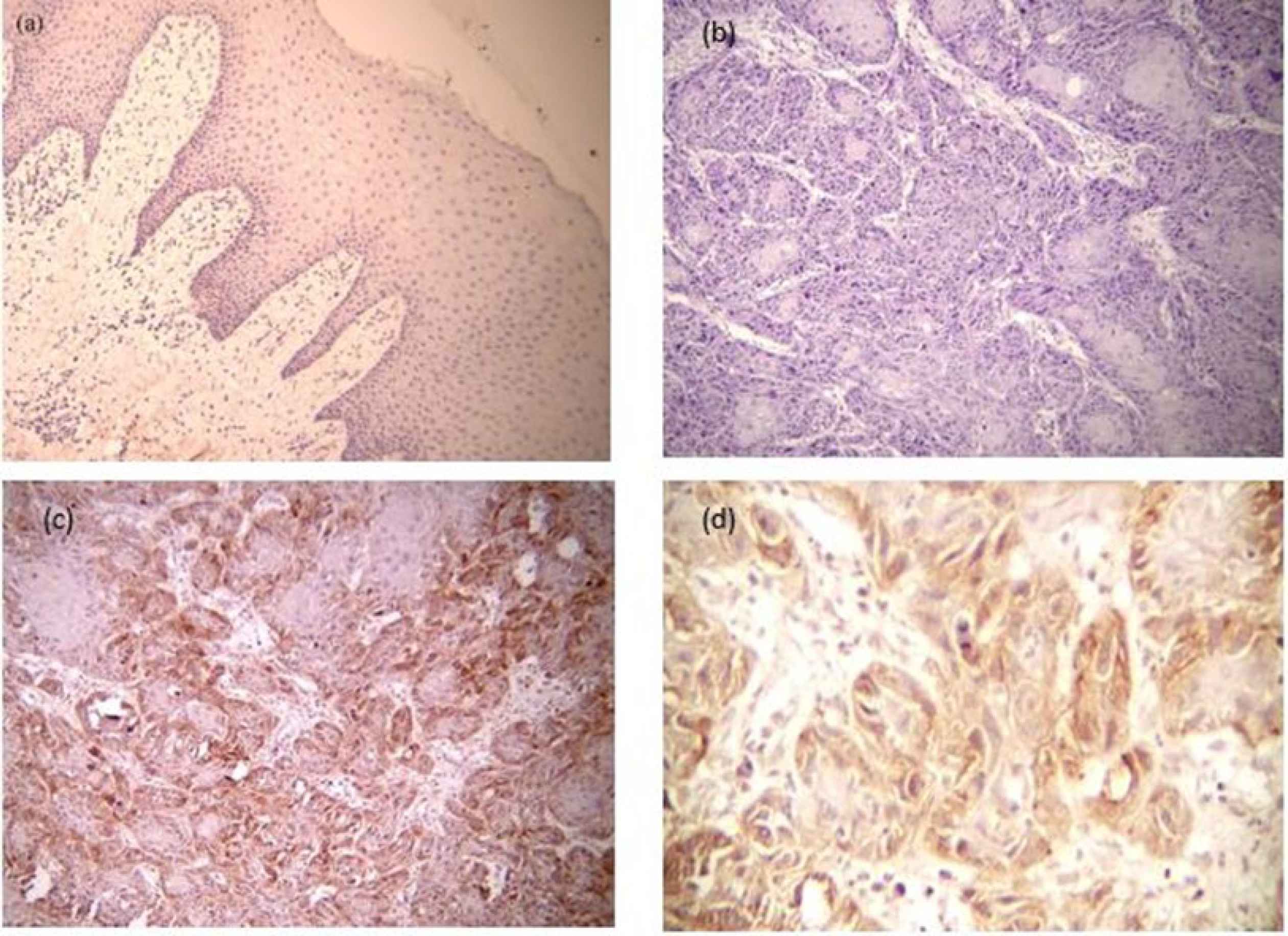 Fig 1.(a) E- cadherin expression in normal oral epithelium (×100). (b) H & E section of moderately differentiated OSCC. (c) Reduced expression of E- Cadherin in OSCC in same H &E microscopic field (×100). (d) Reduced expression of E- Cadherin in OSCC (×400)