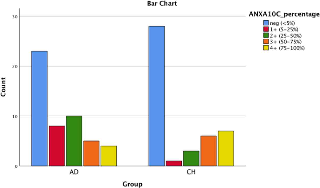Fig. 4.Bar chart shows AnnexinA10 cytoplasmic positivity in PDA and CCA