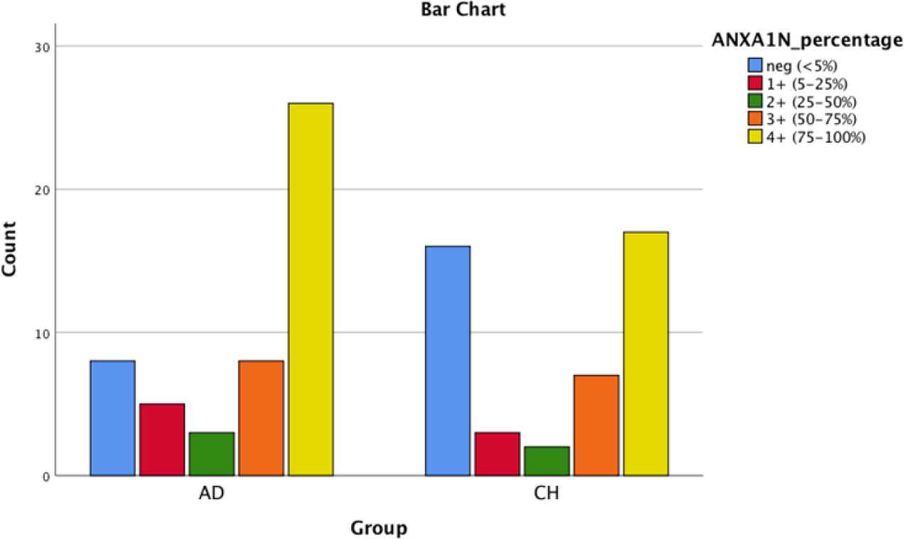 | ANXA1(N) | 16% | 10% | 6% | 16% | 52% | 35.6% | 6.7% | 4.4% | 15.6% | 37.8% | 0.28 |