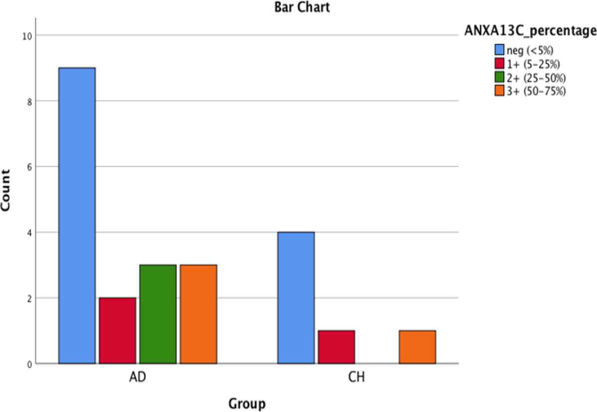 Fig. 5.Bar chart shows AnnexinA13 nuclear positivity in PDA and CCA