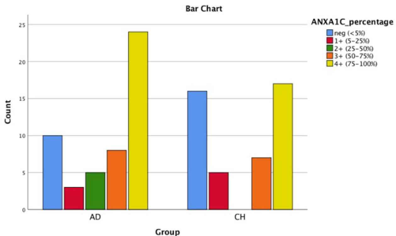 Fig. 2.Bar chart shows AnnexinA1 cytoplasmic positivity in PDA and CCA