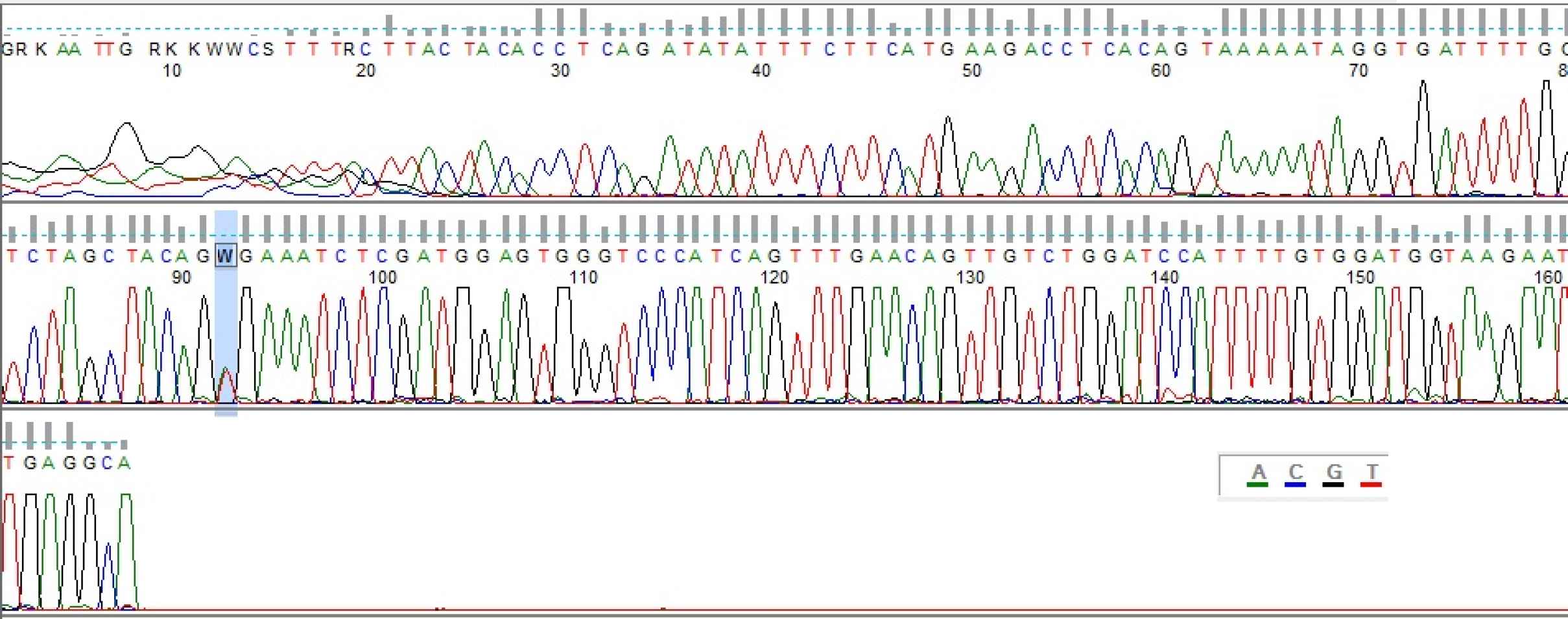 In the present study, we determined the frequency of the BRAF-V600E mutation in 41 specimens of AM. All samples were evaluated by PCR and Sanger sequencing. As indicated in Figure 1, PCR examination showed that among all 41 samples, the BRAF-V600E mutation was detected just in one sample (44 years old male patient with nail bed AM). The histological subtype of this case was acral lentigenous melanoma (ALM). Further analysis of Sanger sequencing was done on the negative and positive specimens (Figure 2).