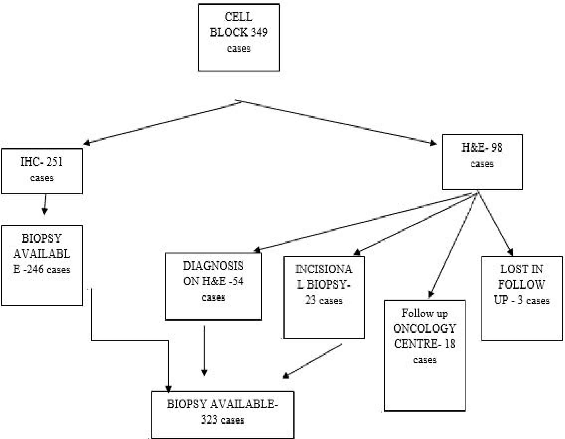 In 251 out of 349 cases, immunohistochemical study could be done on cell block preparation. Among the rest 98 cases, 54 did not require IHC due to clear morphology on H&E staining for a final diagnosis. Of these cases, 23 were non-compliant for IHC study, mostly due to economic reasons and decided to go for direct incision biopsy as it is the gold standard. Of the patients, 18 opted for further investigation and treatment in an oncology center, while 3 were lost in follow up after H&E reporting on cell block. So, the total biopsy results were obtained for 323 cases which remained our study sample (Figure 2).