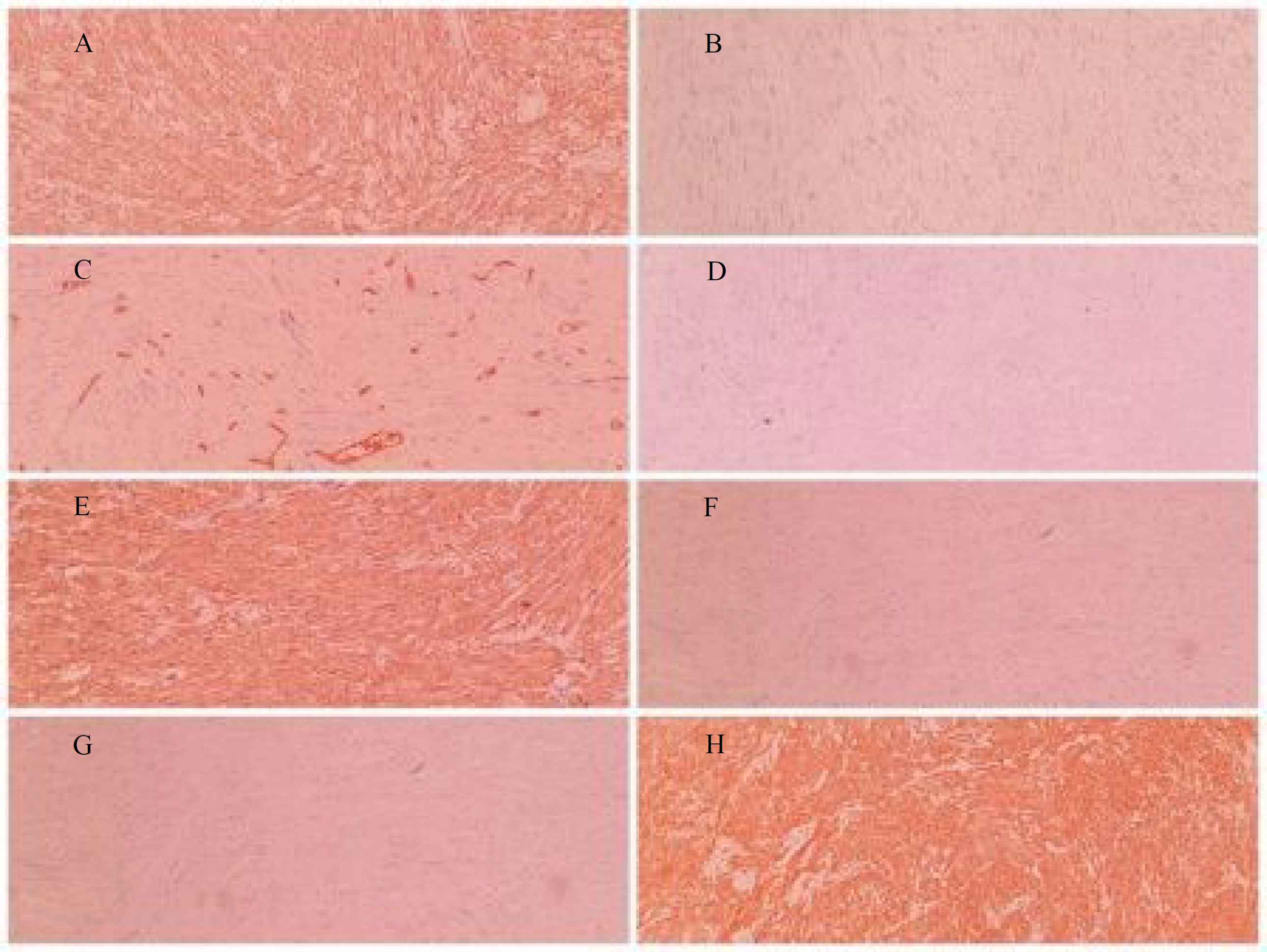 Fig 4.Immunohistochemical staining of primary leiomyosarcoma of the testis revealed (A) Positive SMA, (B) Negative CK, (C) Positive CD34 in blood vessels, (D) Negative C-Kit, (E) Positive H-Caldesmon, (F) Negative DOG-1, (G) Negative SOX-10, (H) positive Desmin