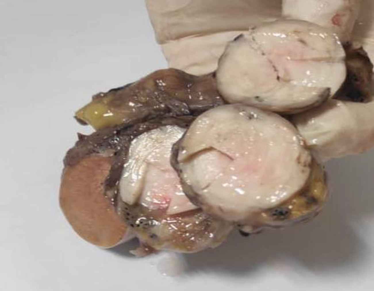Fig 1.Sections show an intra-testicular whitish lesion with whorling pattern in upper pole measuring 4 × 3 × 3 cm