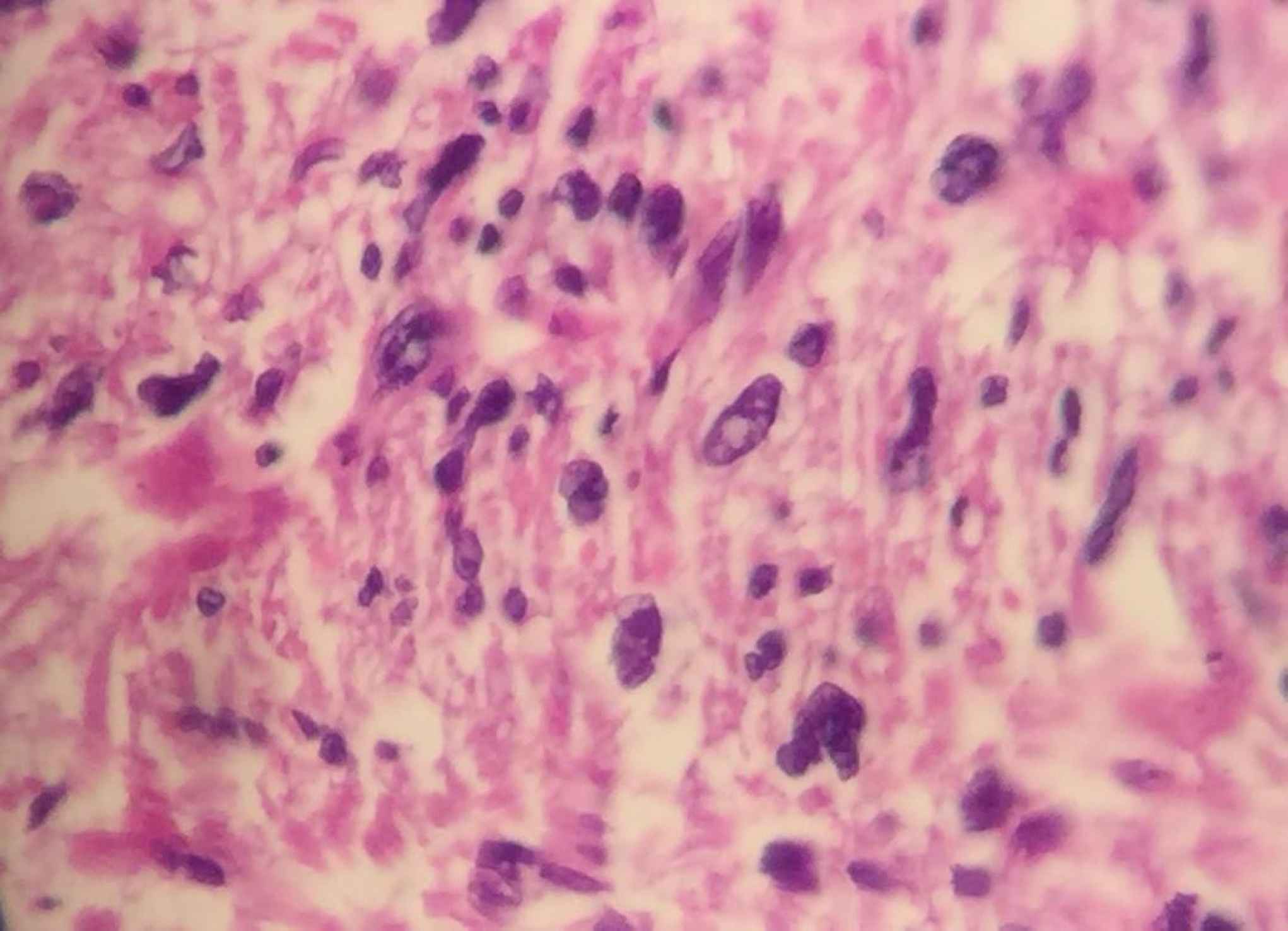 Fig 3.Histological examinations revealed atypical spindle to oval nuclei which showed marked pleomorphism (x400).