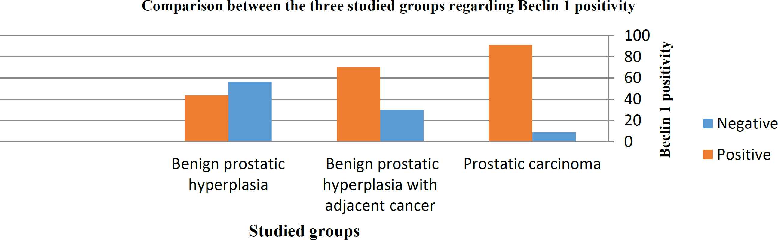 There was a significant stepwise increase of Beclin1 positivity between the three studied groups starting from BPH up to the highest percentage of positive cases appeared in prostatic carcinoma passing through a group of BPH adjacent to tumor. The percentage of cases positive for Beclin1 in the three studied groups was 43.6%, 70%, and 91%, respectively (P=0.000).