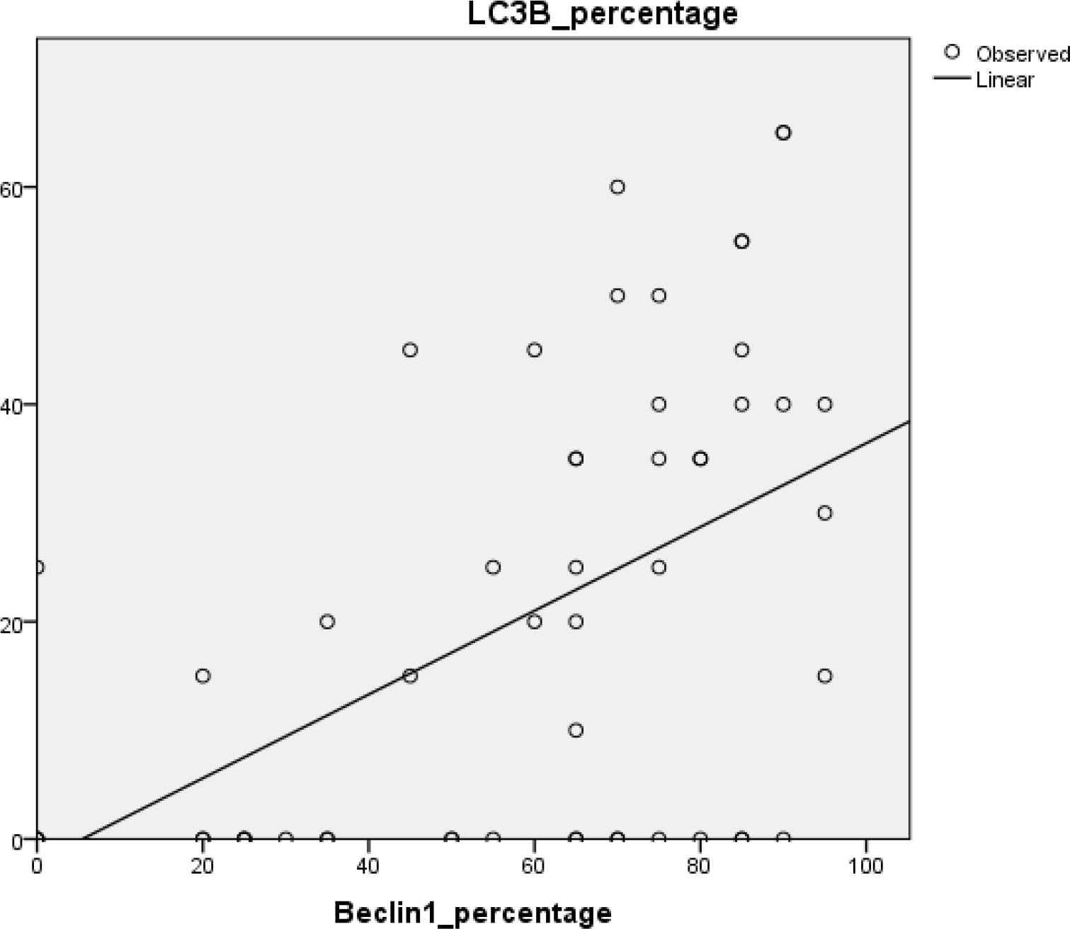Fig. 4.There is a significant linear correlation between the percentage of expression of both Beclin1 and LC3B in the prostatic carcinoma cases (r=0.52, P=0.000)