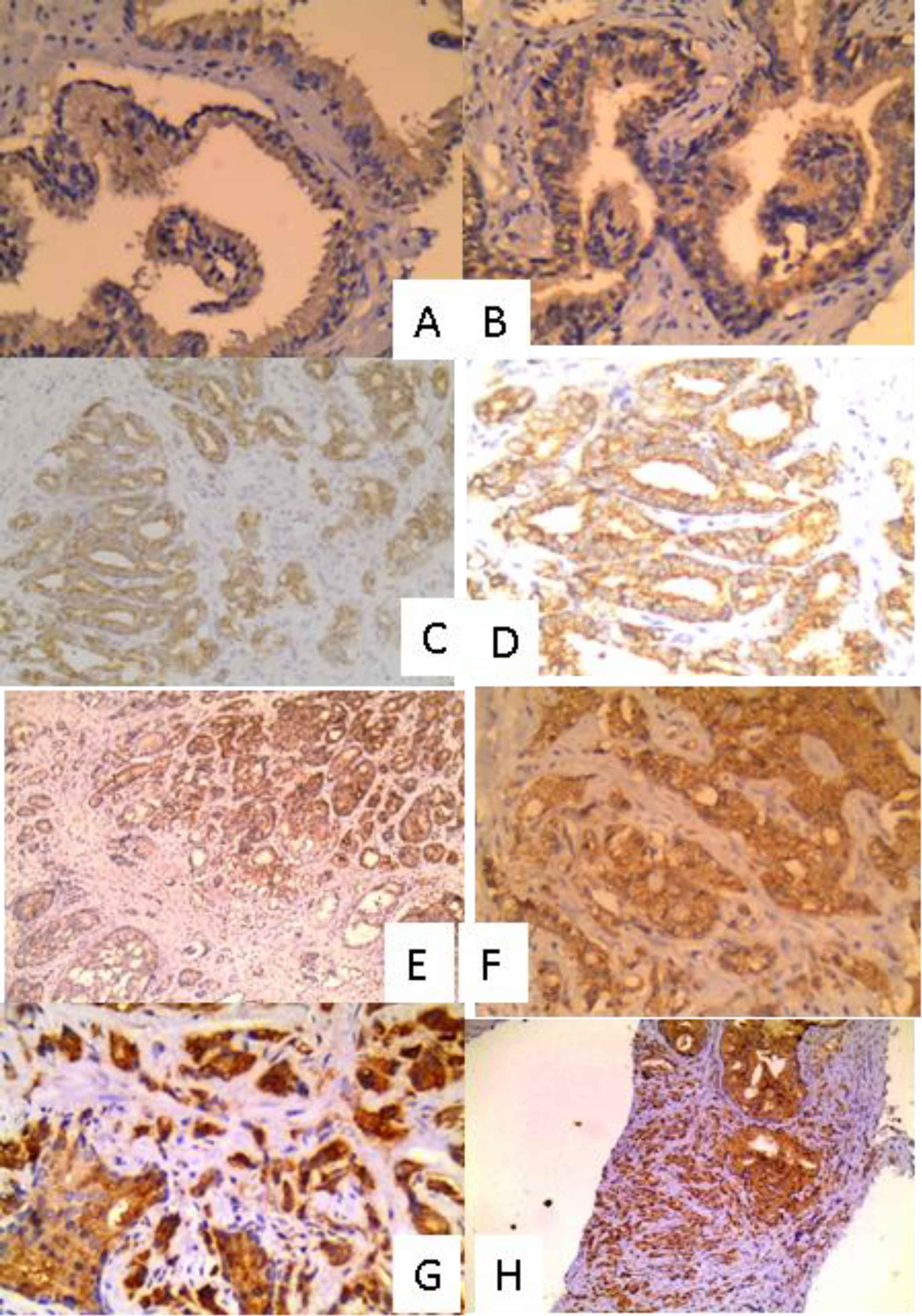 Fig. 1.Expression of autophagy markers (Beclin1 and LC3B) in BPH and prostatic carcinoma cases: A: BPH showing mild positivity for LC3B (IHC X 200), B: BPH showing mild positivity for Beclin1 (IHC X 200), C: Prostatic carcinoma Gleason score 6 showing mild positivity for LC3B (IHC X 100), D: Prostatic carcinoma Gleason score 6 showing mild positivity for Beclin1 (IHC X 100), E: Prostatic carcinoma Gleason score 7 showing moderate positivity for LC3B (IHC X 100), F: Prostatic carcinoma Gleason score 7 showing moderate positivity for Beclin1 (IHC X 200), G: Prostatic carcinoma Gleason score 9 showing strong positivity for LC3B (IHC X 200) and H: Prostatic carcinoma Gleason score 9 showing strong positivity for LC3B (IHC X 100)