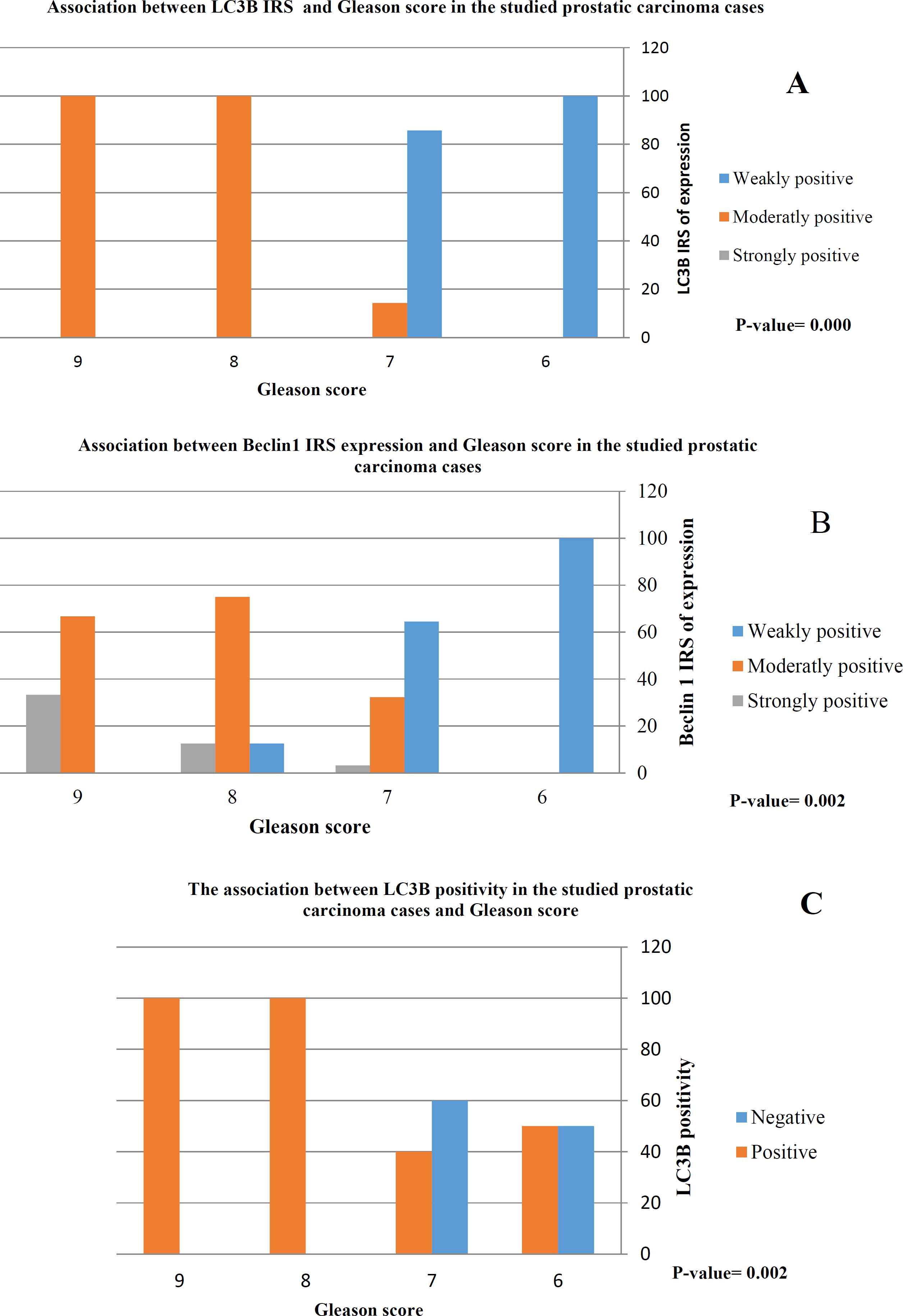Fig. 2.There was a highly significant association between LC3B positivity (C) and moderately and strongly positive expression of LC3B (A) and Beclin1(B) and high Gleason score (score 8 and 9)