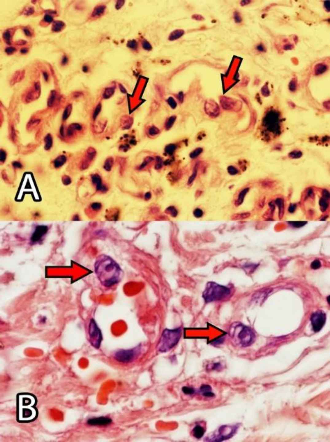 Fig. 1.Swollen endothelial cells with prominent nucleoli of vessels in the alveolar interstitial space (A) and skin (B); (By Shahriar Dabiri MD)