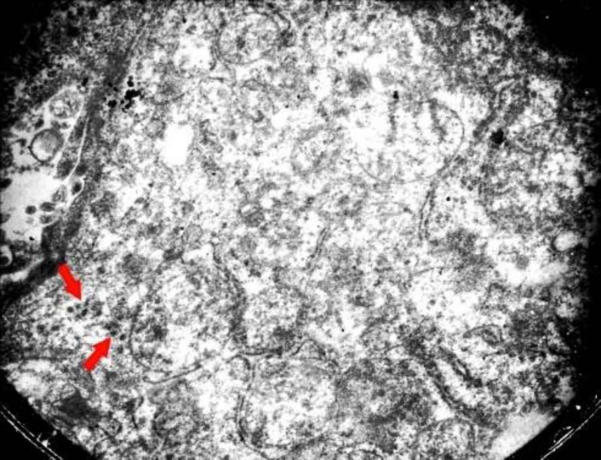 Fig. 3.Electron microscopy showed the presence of virus particles in the cytoplasm and swollen mitochondria about 60 to 150 nm; (Original magnification ×15,000) (Courtesy of Dr. Mitra Rezai, Shahid Beheshti University of Medical Sciences)