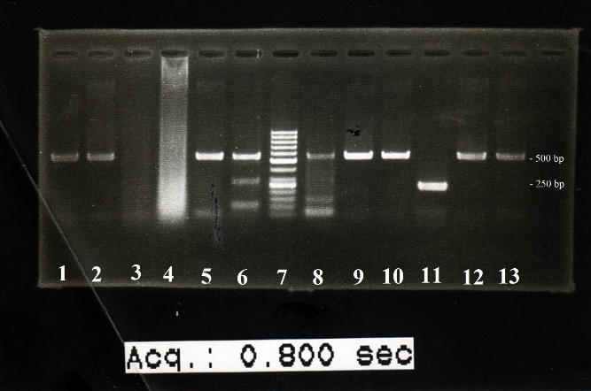 Fig. 1. EBV PCR results: The lanes number 2, 3, 4, 5, 8, 11, and 13 show EBV DNA amplification. Lane number 6 is DNA size marker. Lane number 8 is the positive control. PCR product size for EBV was 210 bp, and the PCR product size for internal control gene (beta-actin) was 597 bp.