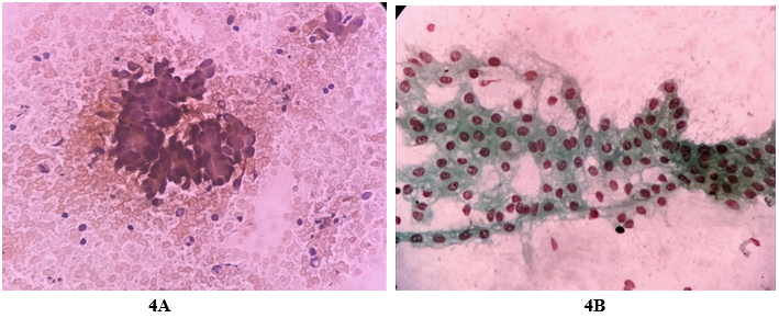 Fig. 4. Comparison of MUFP and PAP cytology staining for serous papillary cystadenocarcinoma ovary showing clusters of round to oval cells with hyperchromatic nuclei, moderate anisonucleosis and pleomorphism