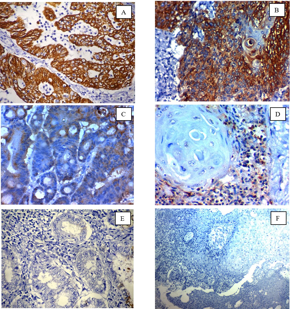 Fig. 1.Immunohistochemical expression of FABP4 in cervical carcinoma: (A); high cytoplasmic expression in high-grade adeno-carcinoma of the cervix ×400, (B); high cytoplasmic expression in high-grade squamous cell carcinoma of the cervix (C); Low cytoplasmic expression in low-grade adeno-carcinoma of the cervix ×400, (D); Low cytoplasmic expression in low-grade squamous cell carcinoma of the cervix (E) ); Negative cytoplasmic expression in low-grade adeno-carcinoma of the cervix ×400, (F) Negative cytoplasmic expression in low-grade squamous cell carcinoma of the cervix x 200