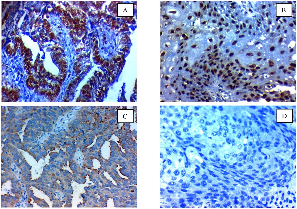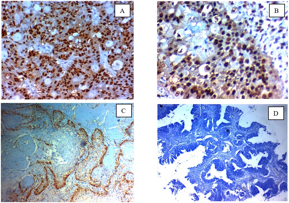 Fig. 2.Immunohistochemical expression of GINS2 in cervical carcinoma: (A); high nuclear expression in high grade adenocarcinoma of the cervix ×400, (B); high nuclear expression in high grade squamous cell carcinoma of the cervix (C); Low nuclear expression in low grade squamous cell carcinoma of the cervix ×400, (D); Negative nuclear expression in low grade adeno-carcinoma of the cervix x 200