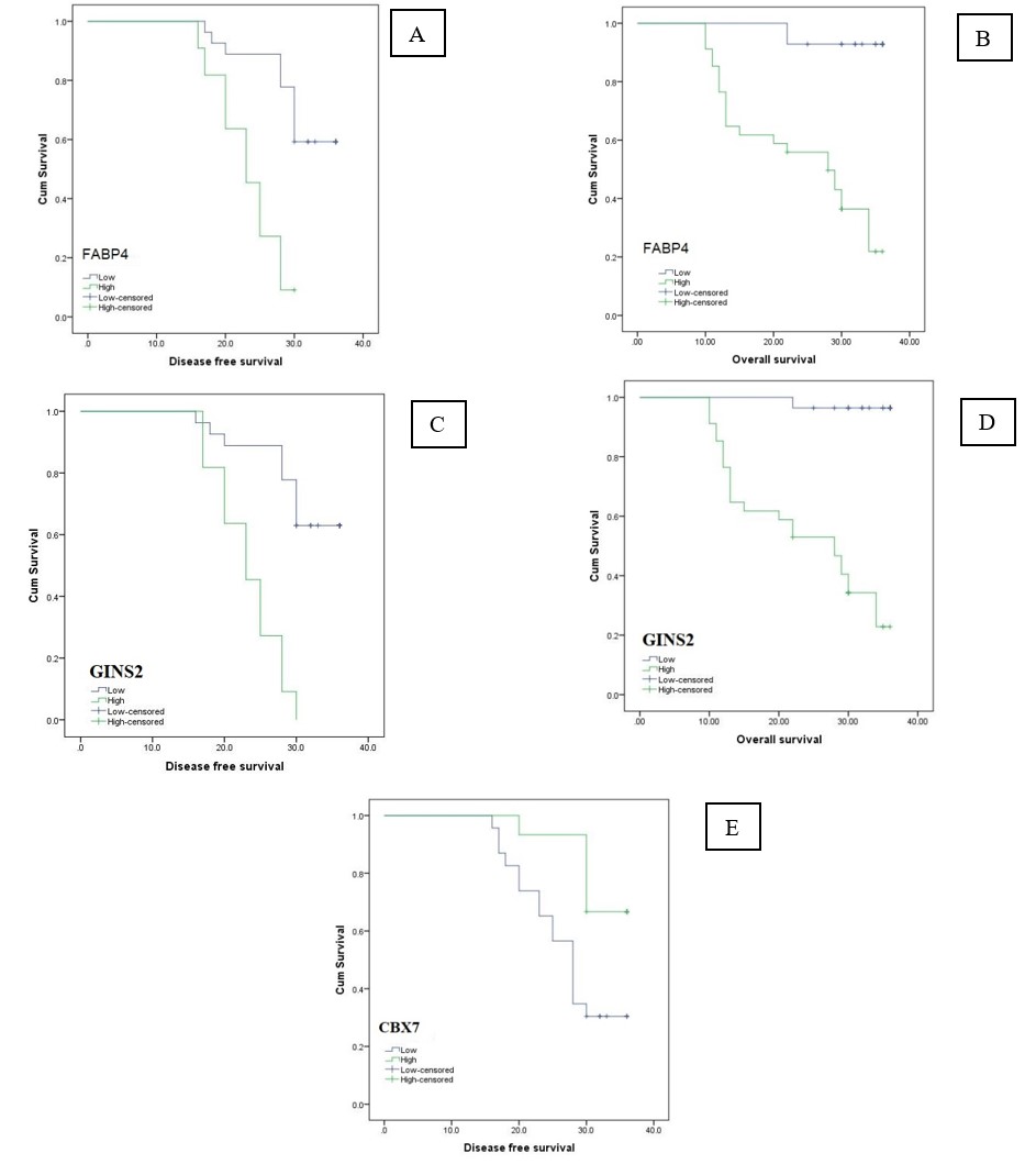 Sections from paraffin blocks of included cases were incubated with rabbit monoclonal anti-FABP4 antibody (1:50 dilution; Proteintech, 12802- 1-AP, China), anti-GINS2 antibody (1:600; HPA057285; Sigma) and anti-CBX7 (1:200 dilution; ab2187 (12-17)3; Abcam, Cambridge, UK). Markers expression was evaluated by assessment of intensity and extent of the stain: staining intensity (no = 0, weak = 1, moderate = 2, strong = 3) and extent (no = 0, less than 30% = 1, between 30 and 60% = 2, more than 60% = 3). The final stain index was reached by multiplication of the stain intensity and extent scores, reaching values of 0-9. A stain score ≥4 indicates high expression; a score of <4 indicates low expression.